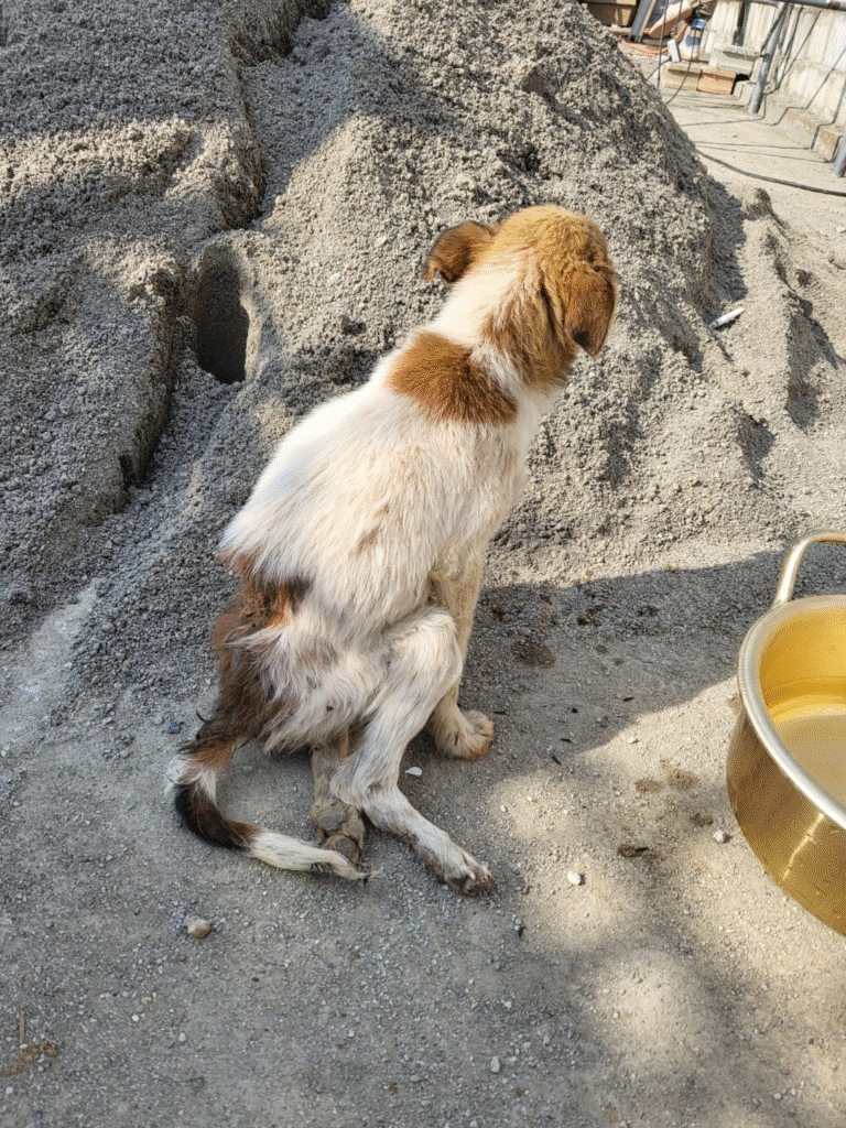 His ribs press tightly against his skin. His fur, once golden, is matted and thin. But the worst of all is his injured hind leg — crushed by a car that never stopped.