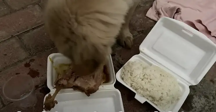 I placed it near him and waited. He sniffed cautiously, then looked at me as if asking permission. Slowly, he began to eat, savoring every bite like it was the first proper meal he’d had in days. When I tried to lift him gently, he flinched, retreating with a terrified cry.