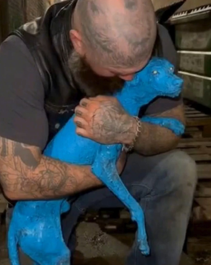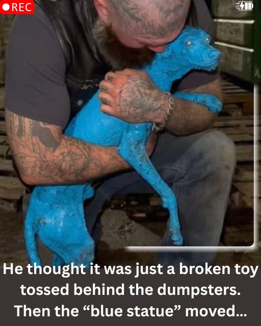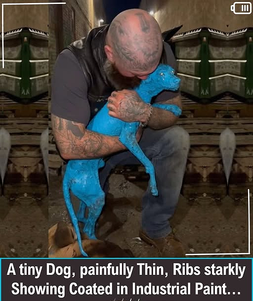 The small body was covered in thick blue industrial paint, hardened into a shell so stiff the dog couldn’t bend a single joint. His fur had turned into a cold crust that froze him in place. He couldn’t sit. He couldn’t curl up. He couldn’t protect himself from the wind that cut through the alley.
