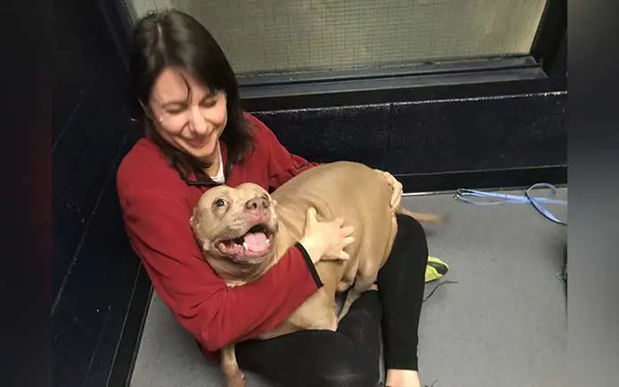 Among the rows of kennels was a seven year old pit bull who immediately caught the volunteer’s attention. Her name was Cinnamon. Unlike the other dogs who barked or wagged their tails, she sat very still.