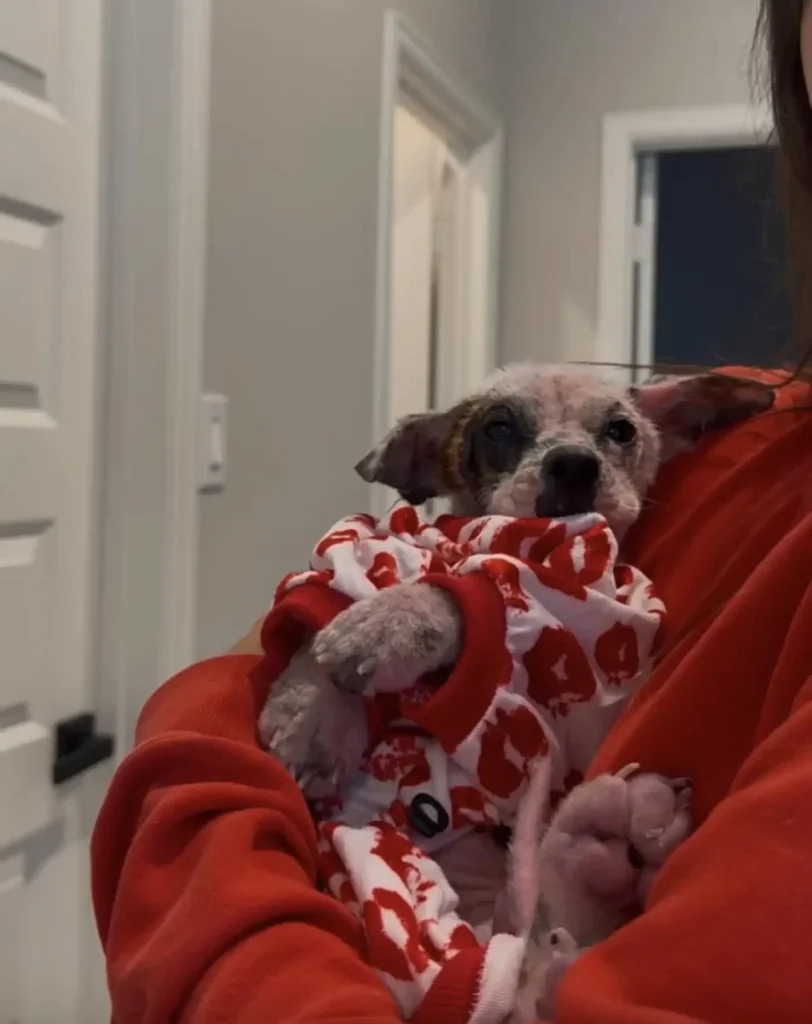 Arriving at her foster home, Violet was still frail and nearly hairless. Without fur to protect her, she shivered at the slightest draft. Bri gently dressed her in soft pajamas to help soothe her skin and give her a sense of comfort. In that moment, the tension in Violet’s body began to melt away. She curled into her bed and drifted into a deep sleep, the kind that only appears when fear has finally been replaced with safety.